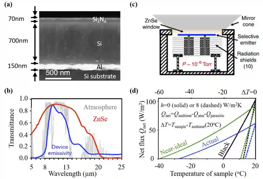 图4. 辐射制冷器. (a) 首次实现白天辐射制冷的辐射涂层;(b) 目前获得最大制冷温差的发射涂层;(c) 目前获得最大制冷温差的制冷器结构;(d) 目前获得最大制冷温差的制冷器性能曲线。