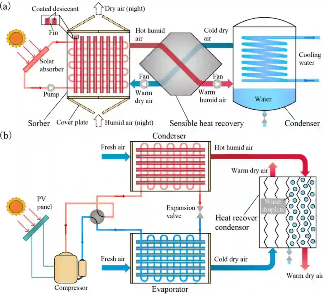 图10. 规模化太阳能空气取水系统设计.(a)带热回收设计的、太阳能热水驱动的空气取水系统,夜间吸附水蒸气、白天脱附水蒸气并将其冷凝成液态水;(b)太阳能光伏驱动的空气取水系统,类似于传统的除湿机式空气取水机,但是由于蒸发温度高、冷凝温度低,其能效显著高于传统的除湿机。两个系统中所用的吸附床均是表面喷涂有干燥剂的储湿换热器。
