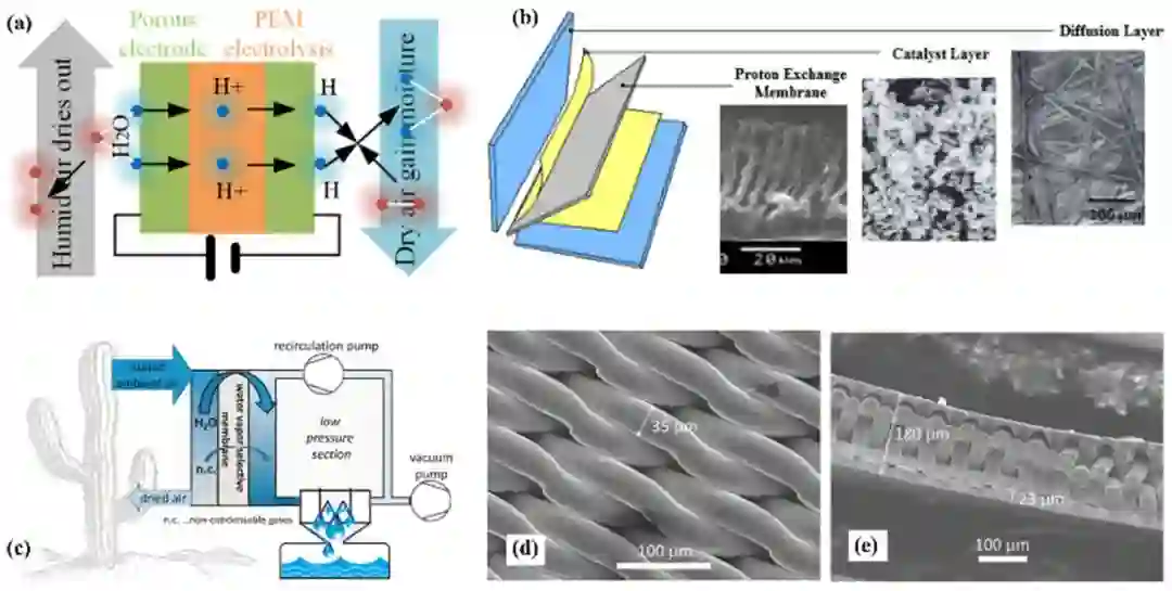 除了可以采用干燥剂浓缩水蒸气,还可以利用选择渗透膜(图7a~b)以及电化学膜(图7c~e)从湿空气中分离出高纯度的水蒸气,然后将水蒸气冷凝成液态水,从而降低空气取水的能耗。