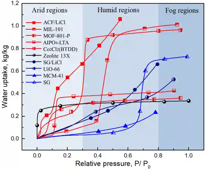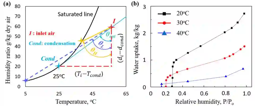 要点:(2)作者提出一种适用于空气取水的理想吸附剂的特征:对温度具有较高敏感度,在低温时(<40℃,吸附过程)平衡吸附量随相对湿度增加而快速增大;高温时(>40℃,脱附过程)平衡吸附量迅速降低且基本保持不变(图8b)。根据经验,空气取水过程中的吸附温度通常低于40℃,而脱附温度则高于40℃。