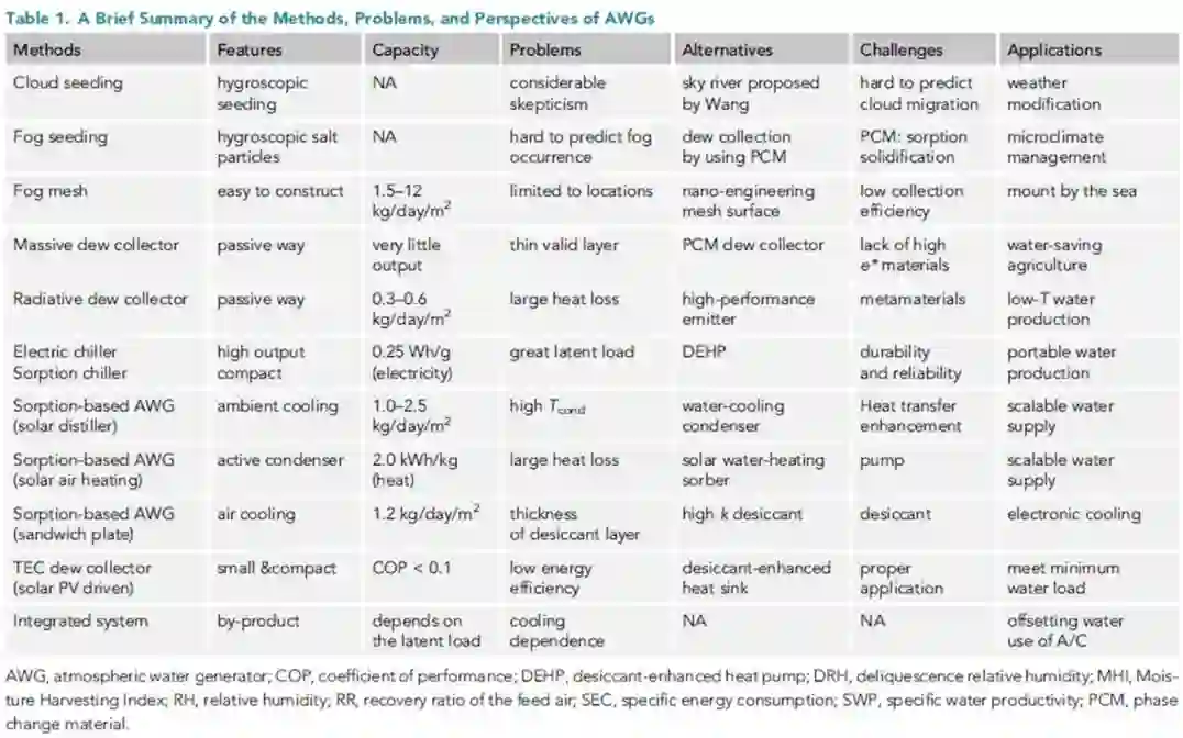 表一. 不同空气取水技术路线的比较