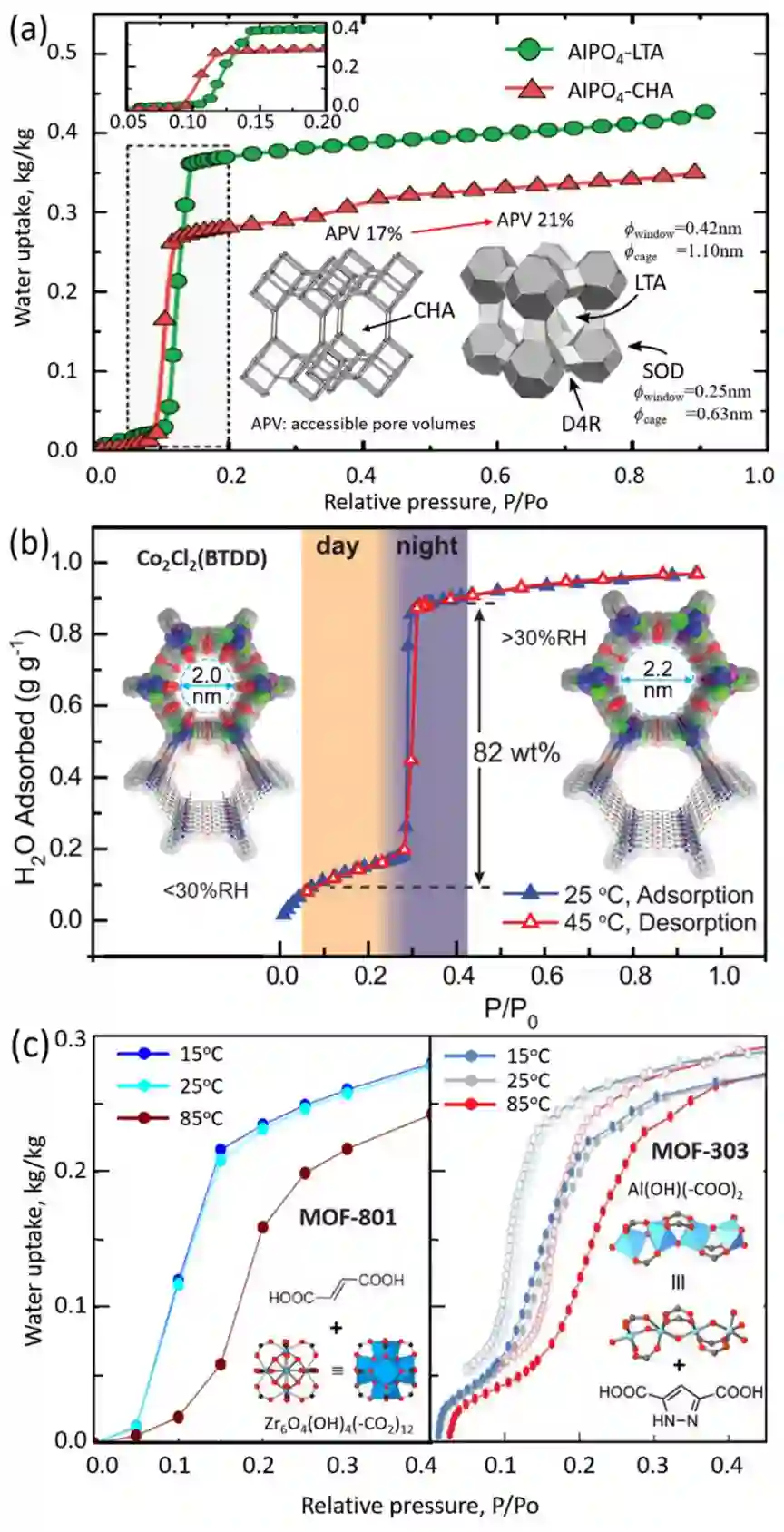 MOF材料具有良好的孔结构和理想的调控性,因此受到广泛关注。高性能MOF类吸附剂的设计策略包括(图6):(a) 采用笼体积更大的LTA拓扑结构来取代AlPO4原本的CHA拓扑结构,从而在基本不改变孔径大小的情况下显著提高干燥剂的吸水能力。(b) 减小回滞并最大化孔体积是理想干燥剂的典型特征,对应的吸附剂的理想孔径是水分子的临界毛细直径。但是众多MOF材料的窗口孔径通常大于水分子的临界毛细直径,一个巧妙的策略是合理选择金属位点材料,使其能够通过络合反应在目标相对湿度区间外吸附一定量的水分子,从而将孔径缩小至临界毛细直径。(c) 采用拓扑结构类似的低毒性金属元素取代高毒性金属元素,构建更廉价、更安全、更环保的绿色吸附剂。