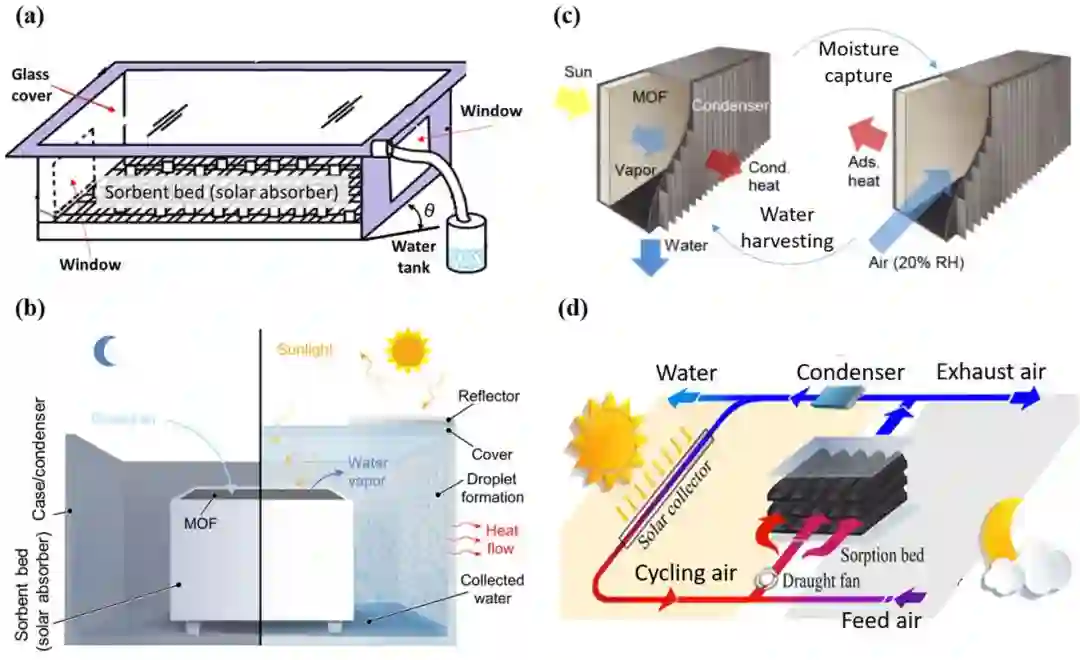 图2. 基于吸附/吸收的太阳能空气取水装置. (a) 传统温室结构蒸馏器;(b)吸附床嵌套于冷凝器中的蒸馏器;(c) 三明治式空气取水器;(d)规模化空气取水系统。
