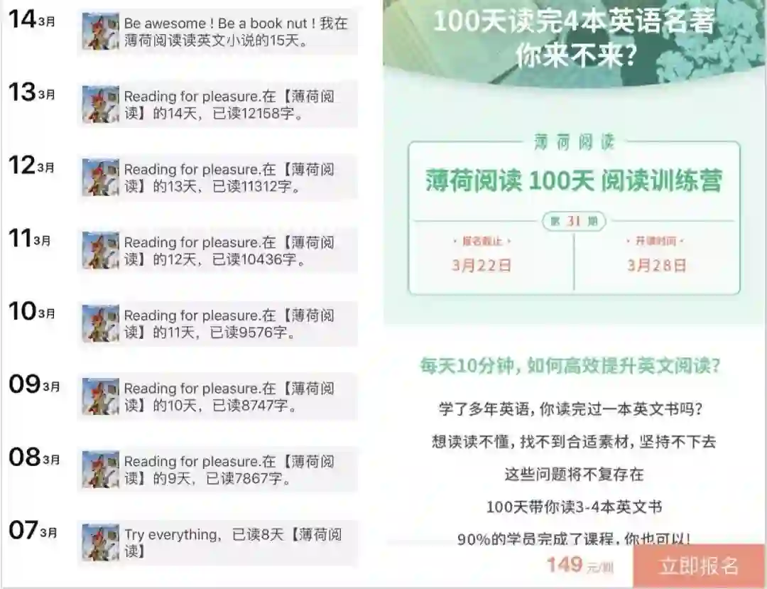 相信17年的朋友圈,大家都能看到一个打卡的分享,“我在薄荷阅读,坚持英文阅读”。病毒式的打卡刷爆朋友圈,让没有读英文的用户心痒痒的,不断转化一批批付费用户。薄荷阅读并不是真的会带给每个人真实的英语学习效果,但带给了“坚持学习的动力”和“学生时代的回忆”。