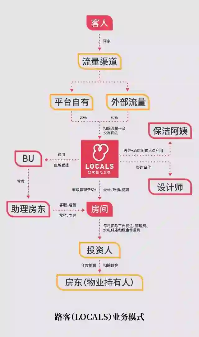 路客从收房就开始介入,提供一系列的运营服务,包括房源设计、工程改造、线上线下接待、运营、清洁、房子微修保养等环节。装修费由业主或者投资人负责,路客从中收8%的管理费,扣除流量平台交易佣金、管理费、水电耗能和租金等费用,剩下的就是投资人收益。