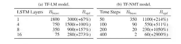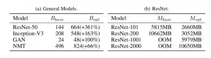 近期深度学习在不同应用中发挥的作用越来越重要。训练深度学习模型的必要逻辑包括适合 GPU 的并行线性代数计算。但是,由于物理限制,GPU 的设备内存(即显存)通常比主机内存小。最新的高端 NVIDIA GPU P100 具备 12–16 GB 的显存,而一个 CPU 服务器有 128GB 的主机内存。然而,深度学习模型的趋势是「更深更宽」的架构。例如,ResNet 包含多达 1001 个神经元层,神经网络机器翻译(NMT)模型包含 8 个使用注意力机制的层,且 NMT 模型中的大部分的单个层是按顺序水平循环展开的,难以避免地带来大量显存消耗。