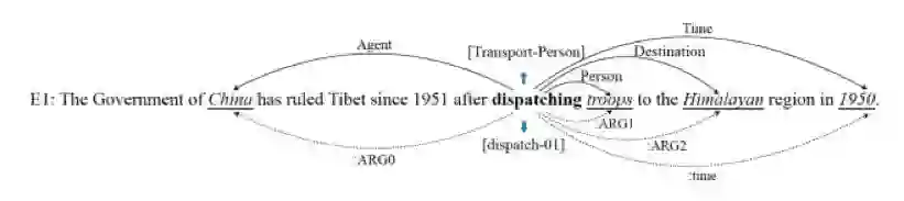 事件抽取的目标是在非结构化的文本中确认事件的触发词(Eventtrigger)和参与者(Event argument),并判断触法词的事件类型(Eventtype),判断参与者在事件中的扮演的角色(Argument role)。有触发词和参与者的短语或文本称为EventMention。如下图的关于Transport-Person 事件的一条EventMention,dispatching是触发词,下划线是参与者,其中China作为Agent参与事件。