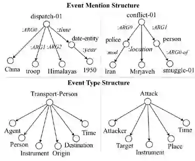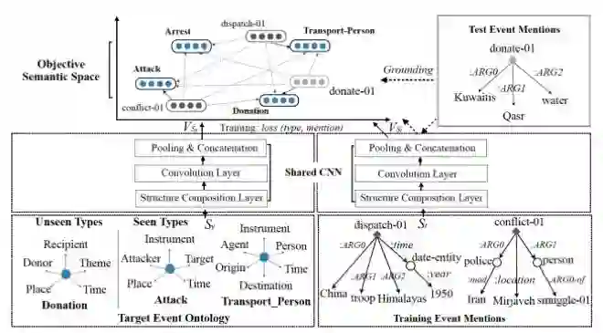 具体来说:对于新的语料,可以用AMR得到具体事件mention的结构,同时提供已定义好的关于事件类型ontology的结构。如上图所示,是对上述E1进行处理后得到mention的结构和一些已定义好的ontology结构。可以看到,事件触发词和事件类型名通常有一些共享含义,同时,两者的结构也趋于相似。本文基于这两点,将mention和ontology的结构表示联合映射到同一语义空间,最小化mention和对应的ontology的语义距离,从而学习一个通用映射函数,将已有样本训练得到的模型迁移到没有样本的事件中,整体框架如下: