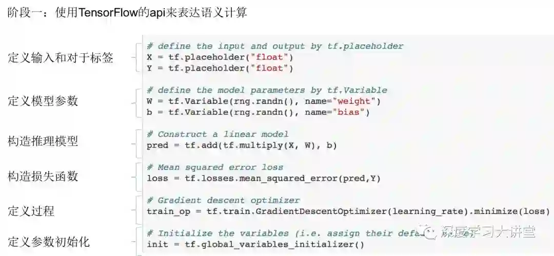 阶段一:组装一个计算图,这里只是用TF的api来表达计算模型,生成的是一个静态图,图由计算的节点以及节点之间的连接表示,这个阶段只是静态的表示了计算,因此得不到任何实际的计算值。