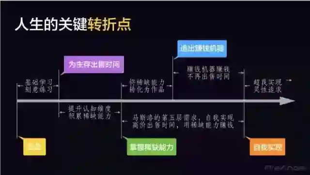 在图中“赚钱机器诞生”这个交叉点之前,有人用两倍时间打了两份工,而非认知提高,他不读书、不思考,永远是卖时间换钱。