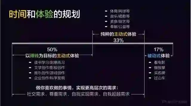 而主动式体验就是需要刻意练习的体验,比如说我要把钢琴从一弹到九级、围棋从初学者下到九段、跆拳道练到黑带、登顶珠峰、把一家企业从零做到上市,这都是不能花钱直接买来的体验,都是主动式体验。