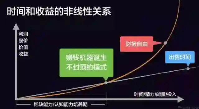 横坐标是时间,纵坐标是收益。当你在赚钱上投入的时间和产出是非线性关系或者指数级关系,这个叫做赚钱,也就是说用极少的时间投入就可以赚很多的钱。做投资就是如此。