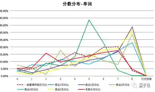 在分数分布上,一起教育科技的引擎在单词和句子上的打分,与其他各家更趋近人类专家的水平。