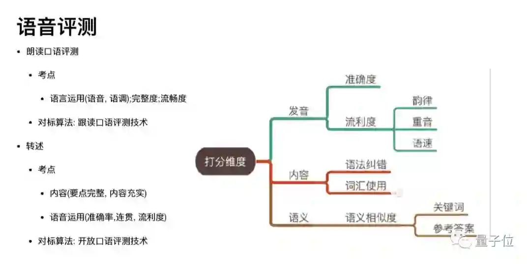 一起教育科技方面解释,一方面是基于K12教学大纲进行考察,要涵盖音素准确率、内容完整度、流利度、重音、 韵律(语调,停顿)等。