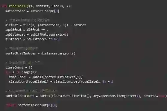 函数knnclassify需要4个输入参数:要分类的输入向量称为A,称为dataSet的训练样例的完整矩阵,称为labels的标签向量,以及k——在投票中使用的最近邻居的数量。