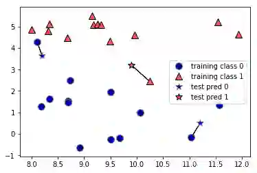 从图中可以看到,我们添加了三个新的数据点,用星星表示。对于三个点中的每一点,我们都标记了训练集中离其最近的点,最近邻算法的预测输出就是标记的这点(用交叉颜色进行表示)。
