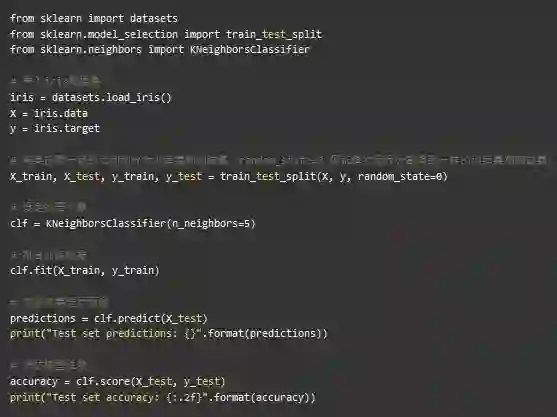 Scikit-Learn是一个机器学习工具箱,内部集成了很多机器学习算法。现在让我们看一下如何使用Scikit-learn实现kNN算法。代码如下: