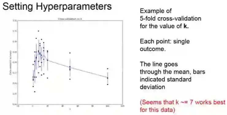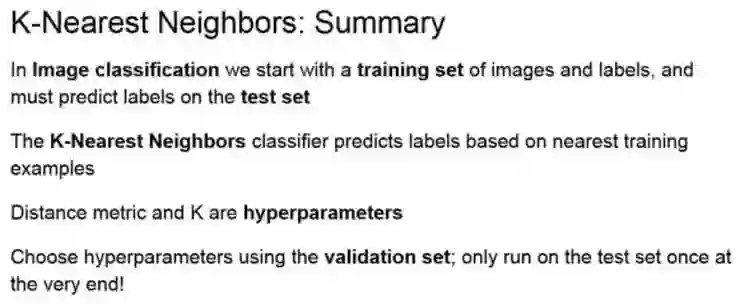 通过使用不同的距离度量,可以将 K-最近邻分类器泛化到许多不同的数据类型上,而不仅仅是向量,不仅仅是图像。例如,假设想对文本进行分类,那么只需要用 KNN 指定一个距离函数,这个函数可以测量两段话或者两段话之间的距离。因此,简单的通过指定不同的距离度量,便可以很好地将这个算法应用在基本上任何类型的数据上。