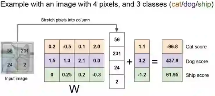 这里有一个简单的例子。左边是一个简单的图像,所以线性分类器的工作是把 2*2 的图像拉伸成一个有四个元素的列向量。