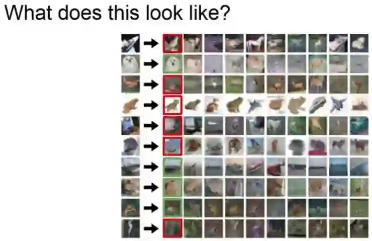 可以看到,它实际上表现的不是很好。这里标记了红色和绿色,图像分类正确与否取决于它的最近邻值,可以看到 KNN 的表现效果不是很好,但如果使用一个更大的 K 值,那么投票操作的结果就可能会达到前三名或者前五名,甚至包括所有的数据范围。