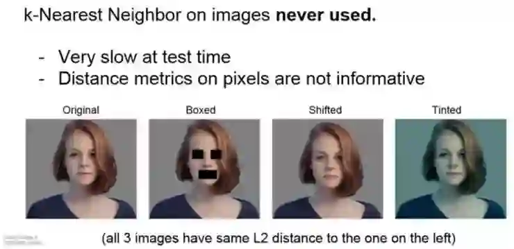 其实,KNN 在图像分类中很少用到,原因包括刚才谈到的所有问题。一是它在测试时运算时间很长,这和刚刚提到的要求不符;另一个问题在于,像欧几里得距离或者 L1 距离这样的衡量标准用在比较图片上实在不太合适。这种向量化的距离函数不太适合表示图像之间视觉的相似度。
