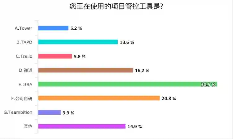 调研的 150 家企业中,公司自研管理工具占比 21%,远远超过了其他类型工具的自研比例。而外部工具用的最多的是 JIRA、禅道,腾讯 TAPD 也十分受欢迎,Tower、Trello 和 Teambition 紧随其后。“其他”的选项中还包括:Phabricator、Asana、TFS、ONES。