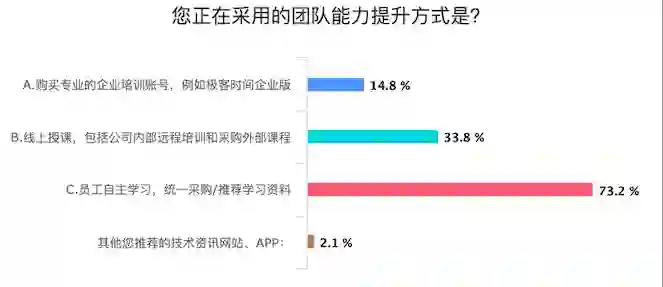 2、在团队能力提升方面,管理者大多希望员工可以自主学习,并为他们提供充足的资金和资源支持。线上授课和购买专业的企业培训账号也成为很多团队的必选项。