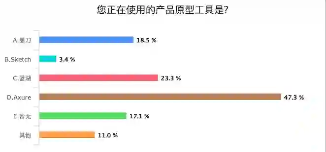 4、身为一位产品经理或设计师,原型设计工具是必不可少的工作伙伴,但也有 16.8% 的受访者并未使用产品原型工具。调查显示,Axure 稳稳占据了近半数团队,蓝湖、墨刀也十分受欢迎,“其他”的选项中还包括:Sketch、Mockup、InVision、Proto.io 等。