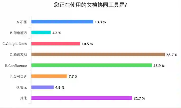 2、文档协同工具的使用比较多元化,腾讯文档和 Confluence 占据大半壁江山,石墨、Google Docs 紧随其后,可以看到有 5% 的企业尚未开启在线文档协同。“其他”项的工具包括:飞书、有道云笔记、Teambition、微文档、语雀、Gitbook、WPS 云文档等,很多企业表示他们是基于开源软件的二次开发。