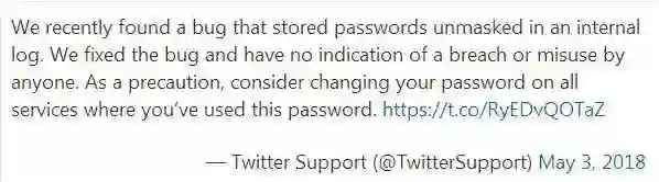 目前还不清楚Twitter是什么时候发现这一密码安全漏洞的,也不清楚这些密码不被安全保护的时间。虽Twitter已将其修复,但Twitter还是应修改密码,以确保个人账户信息安全。