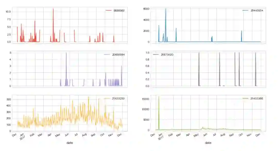 比赛的数据只有门店、商品ID,所以很多诸如门店位置、天气情况、当地收入水平、各种体育赛事信息、搜索引擎的关键词趋势等等特征都无法加入,给比赛增加了一定的难度。