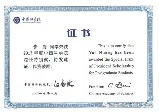 日前,中国科学院大学研究生奖学金、奖教金名单揭晓,自动化所智能感知与计算研究中心黄岩博士、王亮研究员分获2017年度中国科学院院长特别奖、优秀导师奖!