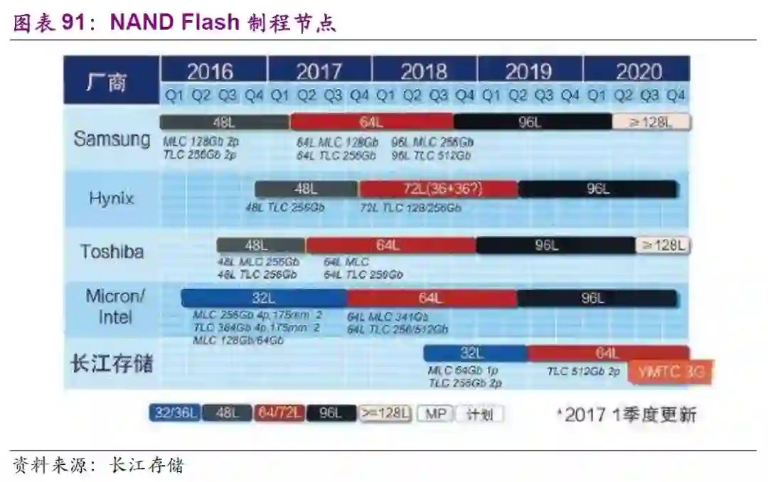 需求端:下游智能手机闪存存不断从16G到32G、64G、128G甚至256G升级导致嵌入式存储快速需求增长,同时随着SSD在PC中渗透率提升导致SSD需求快速增长。