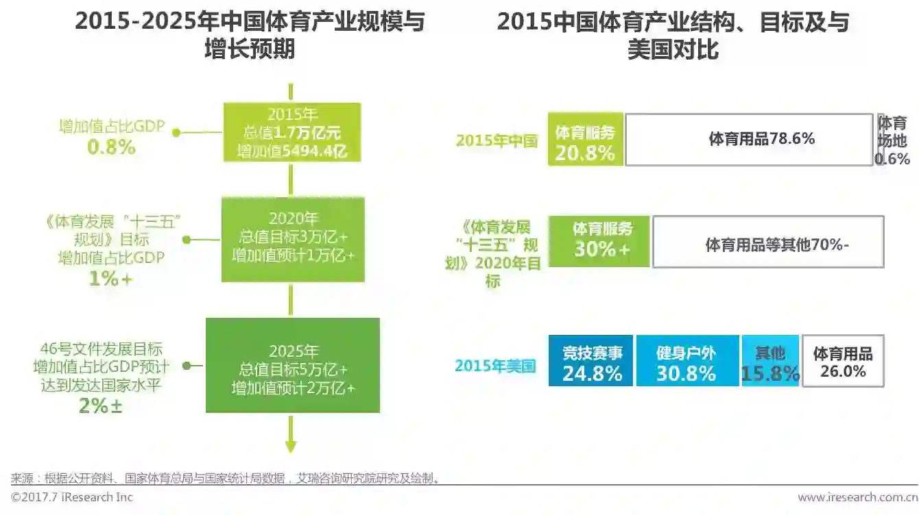 在各方面因素利好的情况下,自2014年开始中国体育行业规模发展迅速。2015年中国体育产业总规模为1.7万亿元,增加值为5494亿元,占国内生产总值的比重迅速增长到0.8%,在此基础之上,2017-18年有望提前完成十三五规划中2020年增加值占比1%的目标。然而中国体育产业结构发展仍不均衡,2015年体育服务业占比仅为20.8%,远低于美国同期水平;但这也说明在政策的支持带动下,体育服务业有着极其广阔的发展利好空间。