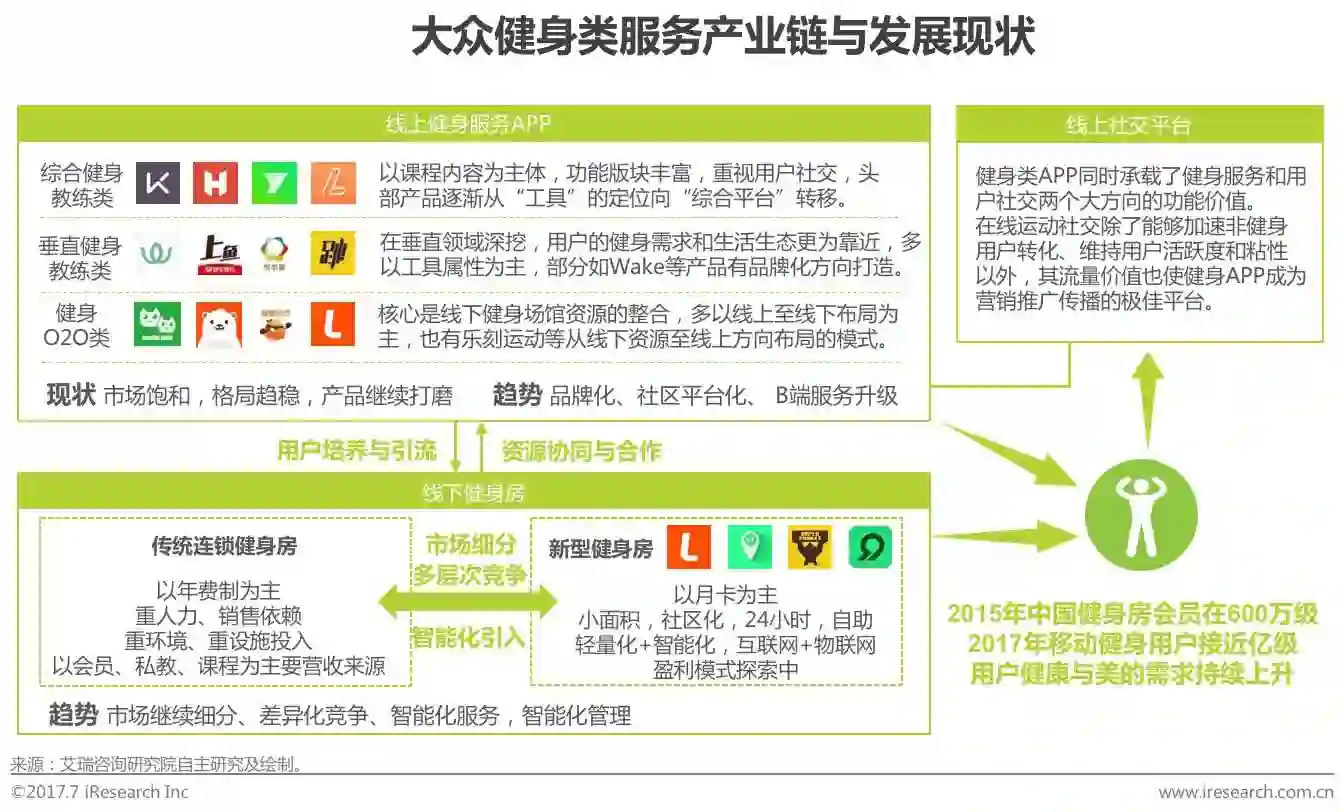 用户需求和技术红利带动移动健身服务的兴起和健身房的革新,线上健身品牌塑造与线下场馆智能化发展是大趋势