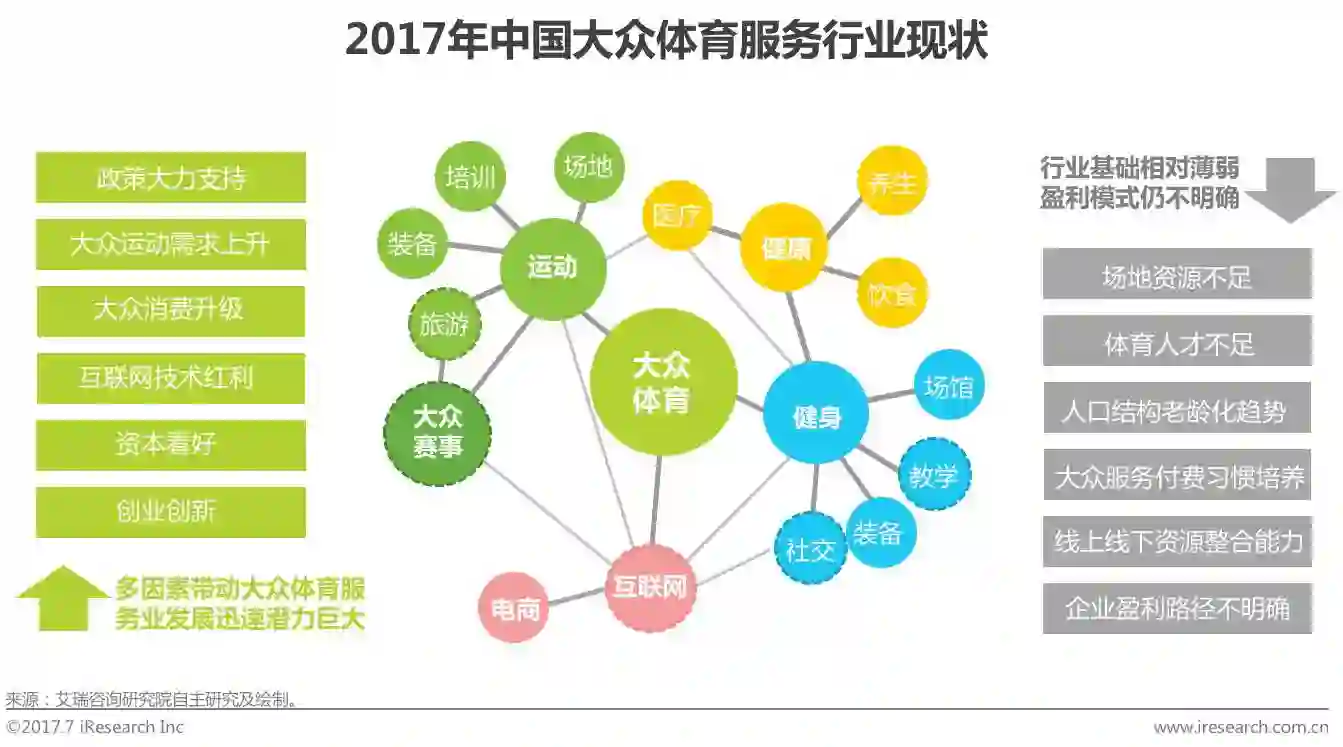 伴随着政策倡导、健身社会风尚形成、大众运动需求上升和生活方式升级等积极因素影响,大众体育行业迎来巨大的市场商机。虽然体育面临着基础设施不足、人口付费意愿需长期培养、服务链条不成熟等诸多问题,但在互联网技术带动下,大众体育服务业出现更多可挖掘的市场需求和机会点,催生出多种细分领域和交叉领域的新型服务模式,可挖掘空间巨大。