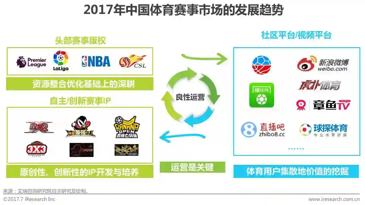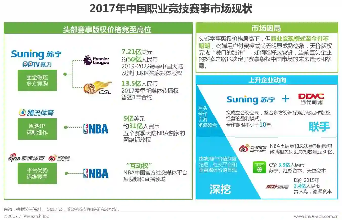 • 中国竞技赛事服务业目前处于高度依赖成熟版权的阶段,资源整合联动与用户平台价值的开发是重点。