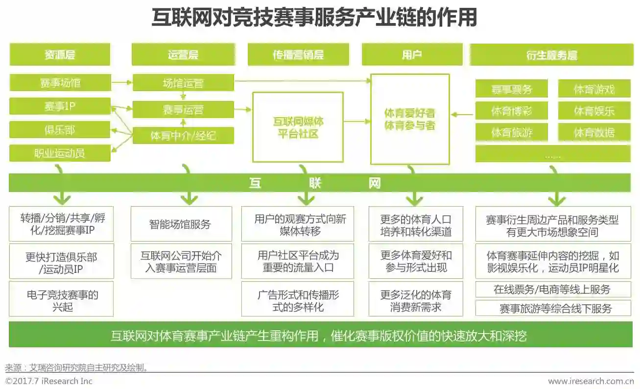 互联网对体育赛事产业链产生的重构作用更多体现在赛事版权开发、新媒体平台和用户营销层面上,催化赛事版权价值的放大和深挖,同时加快终端体育用户的培养和消费升级。