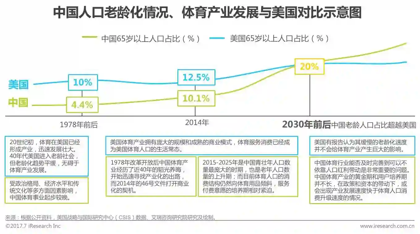 未来十年是中国体育产业最黄金的发展时期,但也是最紧迫的商业化攻坚期,人口红利的消失临近和人口结构巨变预期带给中国体育产业巨大的潜在压力。体育产业需要一个长期酝酿和市场教育过程,相比用100多年的时间建立起成熟体育王国的美国,中国体育产业的起步过晚;但在政策和资本的带动下,或会出现产业发展速度快于体育人口消费升级速度的情况。从长远来看,在商业化道路上攻克难关,抓住市场的同时带动市场,体育人口的消费习惯培养变得至关重要。
