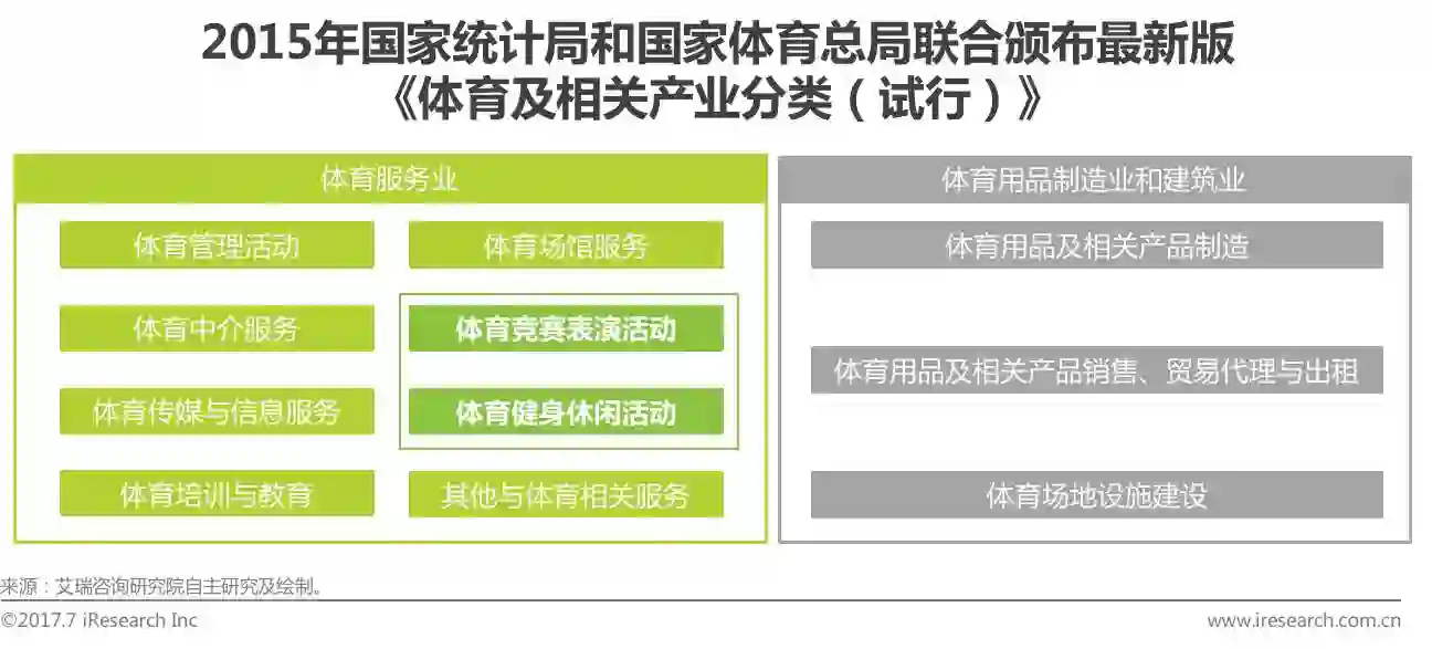 2015年国家统计局和国家体育总局联合新颁布的《体育及相关产业分类(试行)》,将体育产业范围分为11大类,包括体育管理活动,体育场馆服务,体育中介服务,体育竞赛表演活动,体育健身休闲活动,体育传媒与信息服务,体育培训与教育,其他与体育相关服务(如体育旅游、体育彩票等),体育用品及相关产品制造,体育用品及相关产品销售、贸易代表与出租以及体育场地设施建设,除了后3类以外,前8类均属于体育服务业。