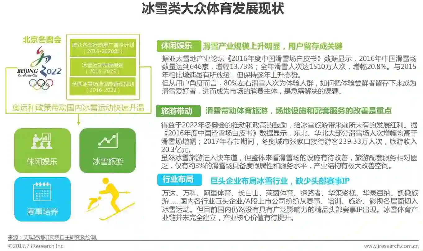 • 冰雪运动对旅游带动明显,基础设施、用户培养、赛事价值等方面待大力开拓;