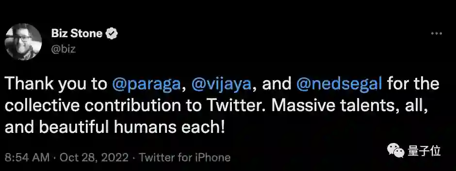 之后,推特的联合创始人Biz Stone发布推文感谢他们对公司的“集体贡献”。