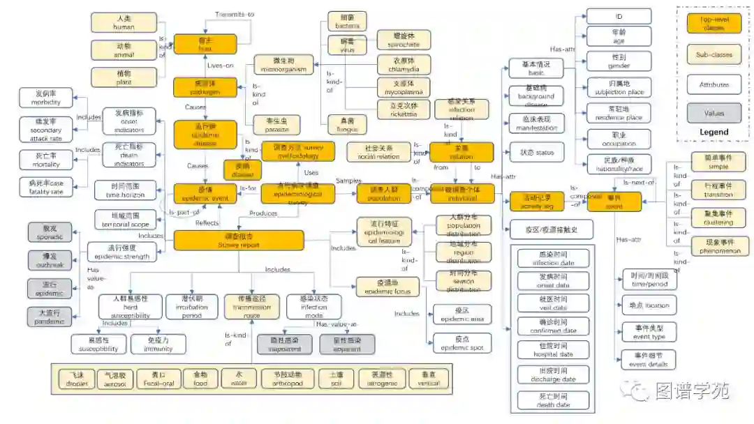 新冠肺炎流行病学知识图谱包含了流行病学知识图谱Schema和基于此Schema定义的新冠肺炎资源实例。其中流行病学知识图谱Schema重点刻画流行病学的基本概念、流行病学调查等内容,未包含“流行病学研究方法”、“预防与控制策略”、“临床治疗与预后”等内容。
