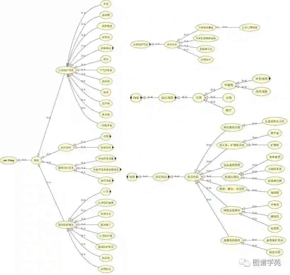 新冠物资图谱包含防控新型冠状病毒所需要的各类物资,主要包括医用防护装备、日常防护用品、医用诊疗设备以及治疗用药。其中,医用防护装备包含了医用手套、口罩、隔离服等;日常防护用品包含洗手液、消毒用品等;医用诊疗设备包含常规检查设备和氧疗设备;治疗用药包含了《新型冠状病毒感染的肺炎诊疗方案》多个版本中的中、西药品。