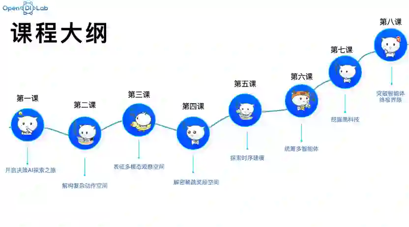 其中,第1节课将会通过多重对比来讲解决策AI问题定义和研究的特殊之处,第2-7节课将会分别以子领域专题的形式,扩充 PPO x Family 的相关成员,最后一节课,将会综合运用之前累积的各方面知识,去设计和搭建一个「终极」智能体。