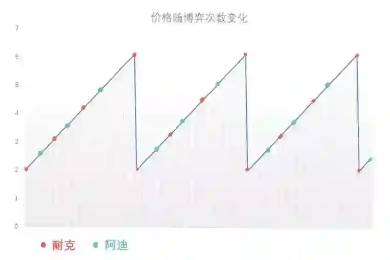 这时候只剩耐克了,耐克也不傻,既然没人和我竞争,那么我为啥要出6块呢,于是赶紧调到2块,这时候阿迪又会进场,周而复始的循环开始了。