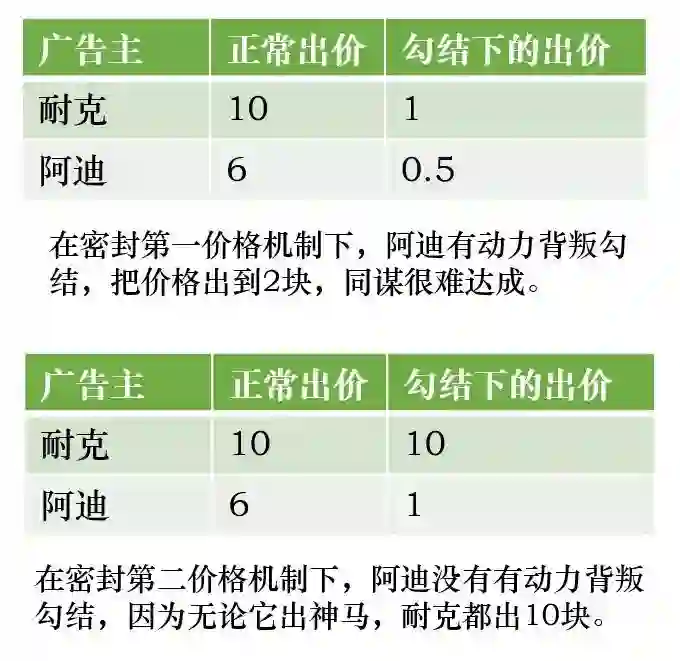 依然拿耐克阿迪来打比喻,耐克的心理出价是10块,阿迪是6块,这时候他们勾结,阿迪出1块,耐克出10块,最终耐克只需要花1块钱就能买走这个广告位,受伤的是广告平台。聪明的人立马会说——难道“第一密封价格”不会出现这种情况吗?比如耐克和阿迪商量好,耐克出1块,阿迪出0.5元,还是耐克以1块钱的价格买走这个广告位啊!
