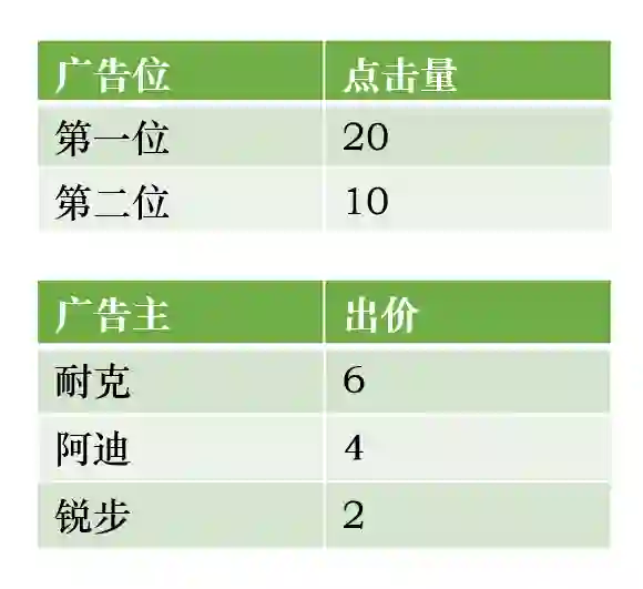 这个竞价方式计算起来相对复杂,我用一个简单的例子来阐述——假如现在有两个广告位,即搜索“跑步”这个关键词的第一位和第二位,第一位能带来20个点击,第二位能带来10个点击。
