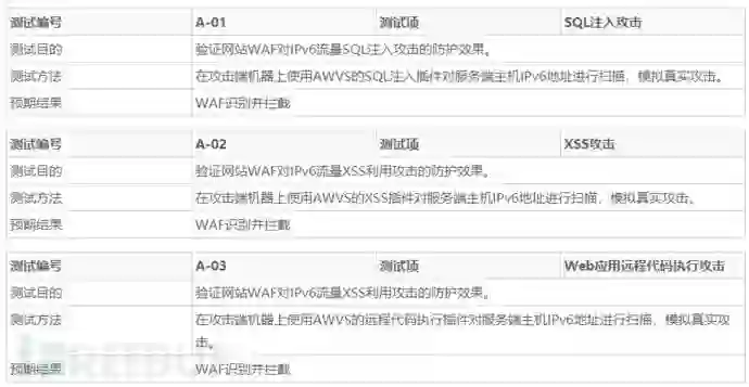 主要评估客户网站安全设备对基于IPv6流量的传统网络及应用攻击的防护效果,验证选取一些典型攻击方式,如SQL注入、XSS、远程溢出等进行测试。
