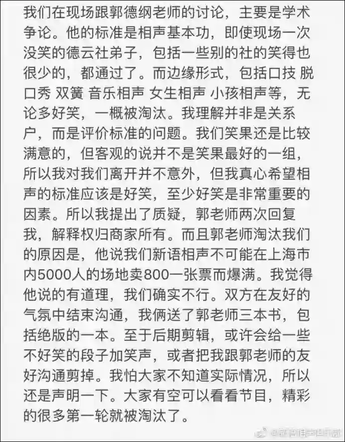 对于网上的批评之声,李宏烨11日通过@新语相声俱乐部 回应称,郭德纲让一些基本没笑点的德云社弟子过了,边缘形式却被淘汰,这是评价标准的问题。他认为相声的标准应该是好笑,因此和郭德纲在“友好的气氛中”进行了沟通,他还送了一本绝版书给郭德纲。